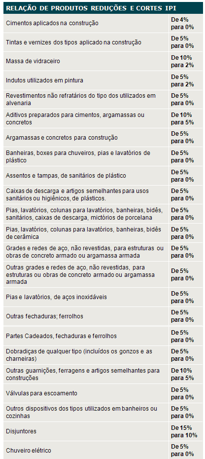 Com redução do IPI, material de construção deve cair até 8,5%. Nas lojas de material de construção os produtos já estão com os preços até 8,5% mais baixos. A queda é consequência da redução do Imposto sobre Produtos Industrializados (IPI) que incide sobre esses itens. As alíquotas do IPI de 30 itens do setor de construção ficarão menores - na maioria dos casos, passarão de 5% para zero. Mas para o consumidor final, o preço pode cair até 8,5%, pois o varejo tem o compromisso de repassar toda a economia que a diminuição dos impostos nos trouxer.